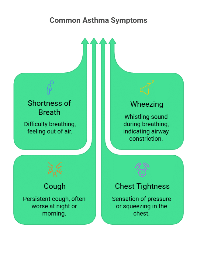 Asthma symptoms to watch for include shortness of breath, chest tightness, wheezing (a whistling sound while breathing), and coughing—especially at night or early morning. You may also notice trouble sleeping, increased fatigue, and symptoms that worsen with exercise or exposure to triggers like allergens, cold air, or respiratory infections.