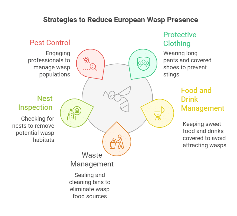 - Preventative measures include securing food sources, covering rubbish bins, and feeding pets indoors during wasp season.