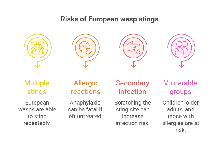 A European wasp sting can cause anything from sharp localised pain to a life-threatening allergic reaction such as anaphylaxis. In Australia, where the European wasp (Vespula germanica) is an invasive pest without natural predators, stings are a growing public health concern. Understanding the symptoms, risks, and correct first aid for bites and stings from this insect is vital for safety — whether at home, outdoors, or in the workplace.