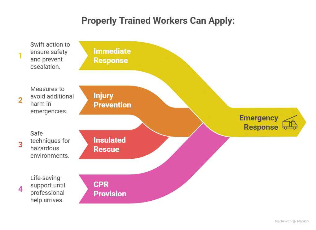 - Proper rescue training dramatically improves outcomes in electrical emergencies by enabling workers to act quickly, isolate danger, and provide CPR if the casualty has suffered shock or cardiac arrest.
