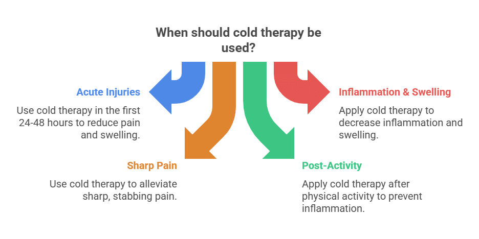 When to Use Cold vs Heat: Cold therapy is appropriate for acute injuries, inflammation, and swelling. Heat therapy should only be used for chronic muscle tension or after the acute inflammatory phase (usually after 48-72 hours). Ensure you consult appropriate medical advice when uncertain.