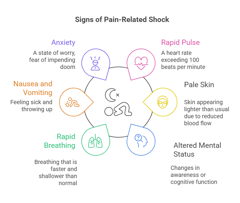 Severe pain can trigger physiological shock responses that may be life-threatening. First aiders must recognise these signs and respond appropriately while managing the patient’s pain.