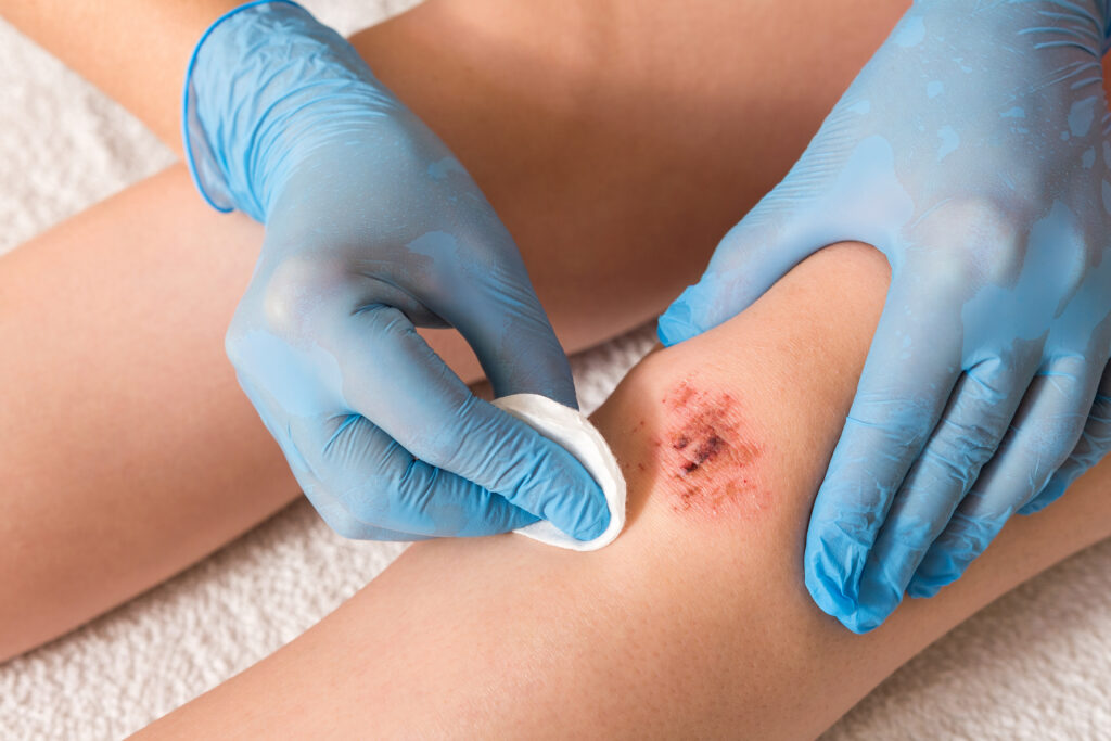 Pat the area dry with a clean, lint-free cloth or sterile gauze. Don’t rub the wound, as this can reopen it or cause further damage. If any debris remains embedded in the cut, use clean tweezers sterilised with alcohol to remove it carefully.